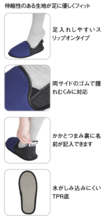 【特徴】 大きな甲部分が足をしっかり包み込む ○院内用・室内用 ○伸縮性のある生地が足に優しくフィット ○両サイドのゴムで腫れむくみに対応 ○かかとつまみ裏に名前が記入できます ○水がしみ込みにくいTPR底 ○抗菌防臭・手洗い可能 サイズ Mサイズ:22.0〜23.0 L:23.5〜24.5 LL:25.0〜26.0 重量:片足(L)80g 材質 表素材:綿100% 内素材:綿100% 底 材:TPR 注意事項 ※画面上と実物では多少色具合が異なって見える場合もございます。