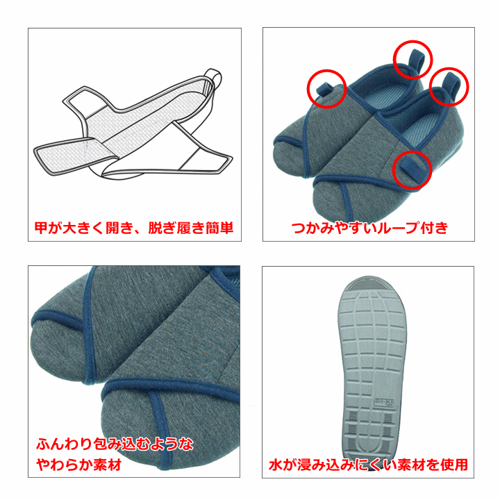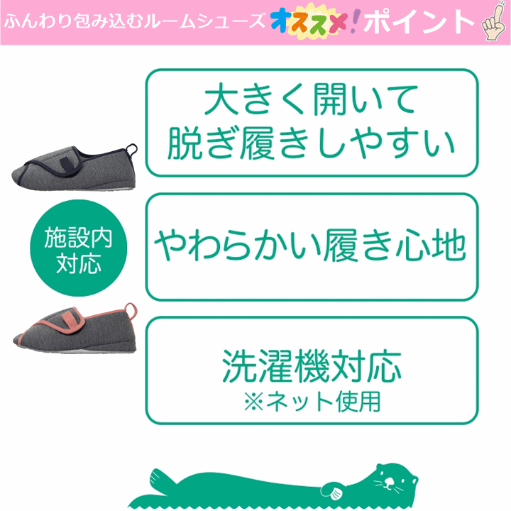 ■■■ ■■■ 商品詳細 大きく開いて脱ぎ履きしやすい ■甲が大きく開き、脱ぎ履き簡単 ■ループ付きで履きやすく脱ぎやすい、脱がせやすい ■ふんわり包み込むようなやわらか素材 ■靴底は水が浸み込みにくい素材を使用 洗濯機で丸洗いOK 汚れたらサッと洗えます ※ネットに入れて洗ってください 商品仕様 【サイズ】S〜LL ピンク :S(21.0〜22.5cm) M(23.0〜24.5cm) ネイビー:L(25〜26.5cm) LL(27〜28.5cm) 【カラー】ピンク、ネイビー 【表内素材】ポリエステル 【靴底材質】TPR 【重量】253g(片足Mサイズ) 【メーカー】ニッポンスリッパ 注意事項 商品画像は色合いや素材感が実際の商品と異なる場合がございます。