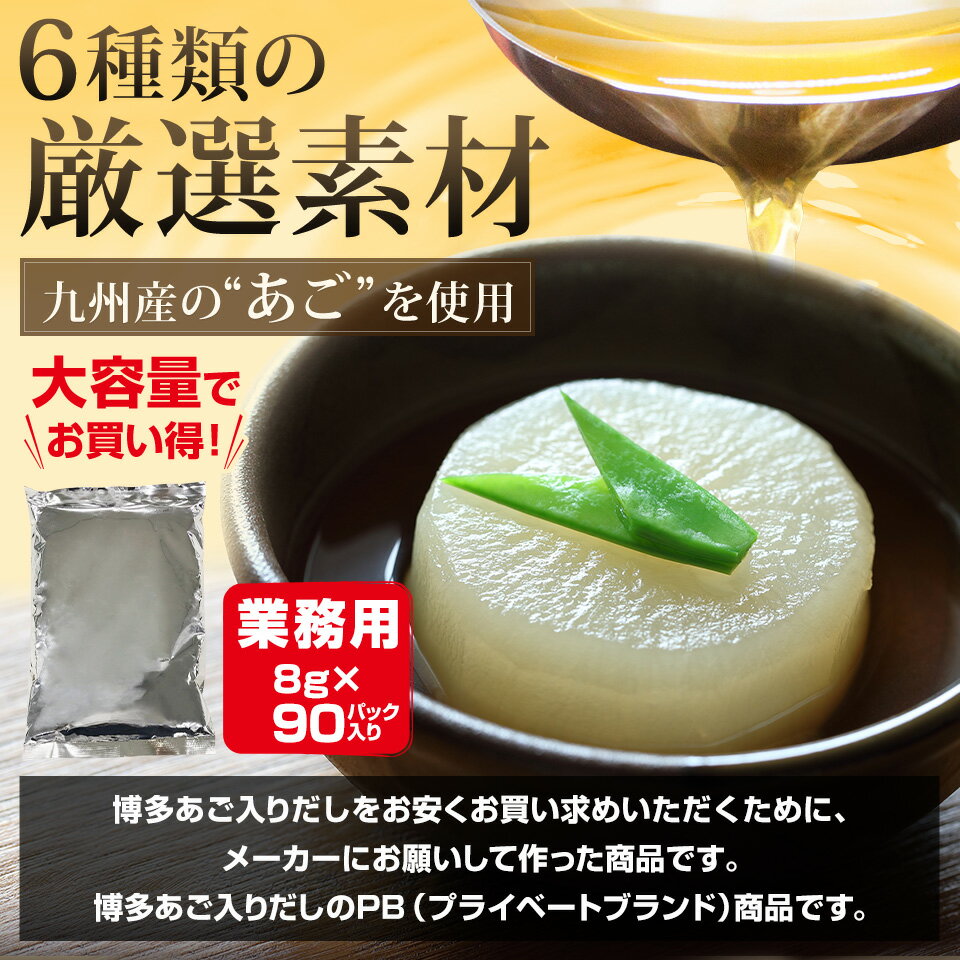 】 商品情報 品名 業務用あご入りふりだし(90包) 内容量 720g(8g×90袋) 原材料 食塩、風味原料(鰹節粉末、鯖節粉末、煮干しうるめ鰯粉末、飛魚粉末、椎茸粉末、昆布粒)、砂糖、鰹だし顆粒、粉末醤油、食用植物油脂/調味料(アミノ酸等)、乳酸カルシウム、(一部に小麦・さば・大豆を含む)【全国一律送料無料】 【離島、東北、北海道も送料無料です。
